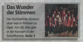 Schwerin/sb/pm. Der Schweriner Gospelchor lädt alle Gospelfans, und auch die, die es erst noch werden wollen, am 30. Mai in die Schelfkirche Schwerin ein... > > > weiter < < < | ||
